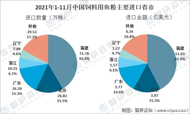福建省为中国最大的饲料用鱼粉进口地,2021年1-11月累计进口饲料用鱼粉71.78万吨,占总进口量的41.5%;进口金额达11.03亿美元,占总进口金额的42.6%;其次北京市进口饲料用鱼粉26.82万吨,进口金额为3.97亿美元。