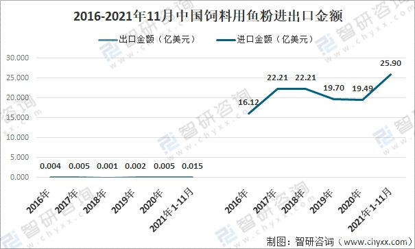 2016-2021年11月中国饲料用鱼粉进出口金额