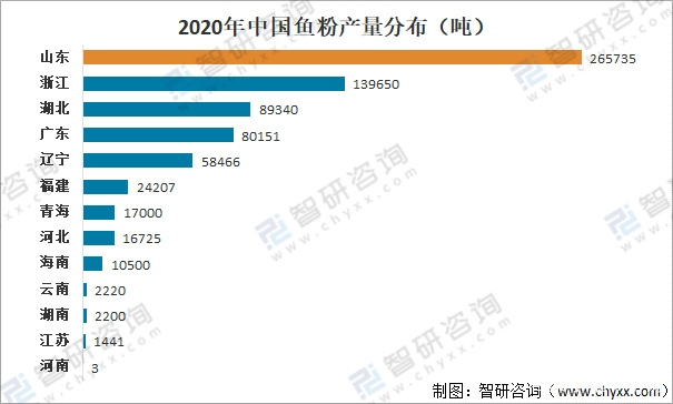 其中山东省为中国最大的鱼粉产地,2020年产量达26.57万吨,占全国总产量的37.6%;浙江省排名第二,产量为13.97万吨,占全国总产量的19.7%;其次另有湖北省、广东省、辽宁省鱼粉产量超5万吨;另有福建省、青海省、河北省、海南省产量超1万吨。
